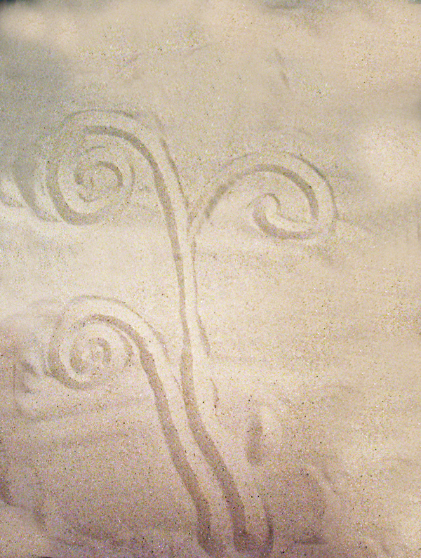 I went and sat down in the beach house, and Jenni appeared again and invited me to share her installation with her, a large installation which she had made right in the centre of the space. It consisted of a large infinity sign made with splashed water, with found objects at the intersection point. Winding out from this intersection were dry furrows that curled round in spirals at the ends. It reminded me of something – couldn’t get what – oh yes! Leunig! We both laughed. Yes, Leunig’s lovely Curly World. Jenni’s design was whimsical, loving and hopeful.